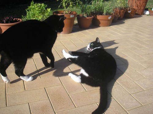 Immediately on stepping through the window, Spiffy spied his brother and strolled over to say hello.